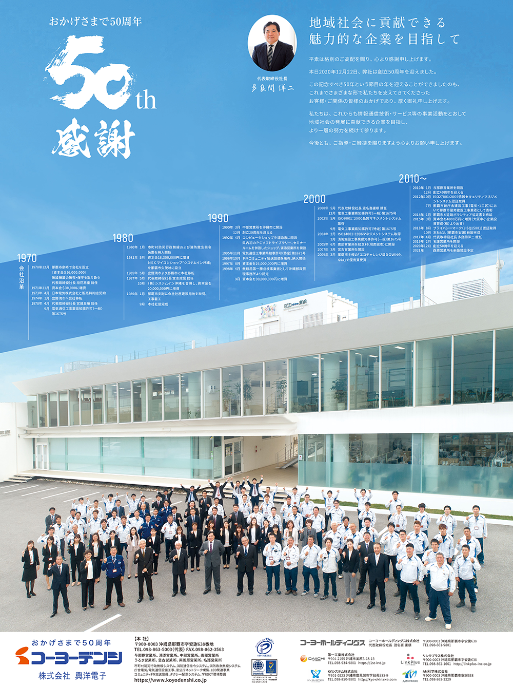 おかげさまで創立50周年を迎えることができました。 2020年12月22日をもちまして、当社は創立50周年を迎えることができました。これもひとえに皆様のご支援、ご愛顧の賜物と心から感謝いたしております。 これからも社員一同、より一層の努力を続け皆様のご愛顧にお応えしていく所存でございます。今後とも、ご支援ご愛顧を賜りますようお願い申し上げます。